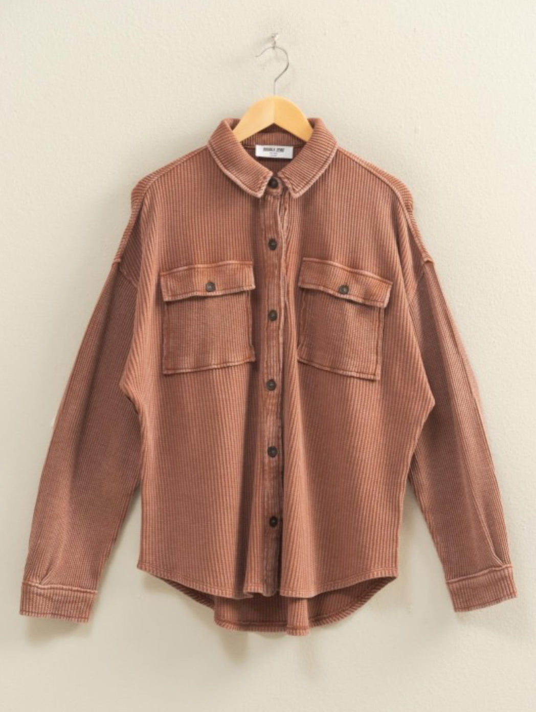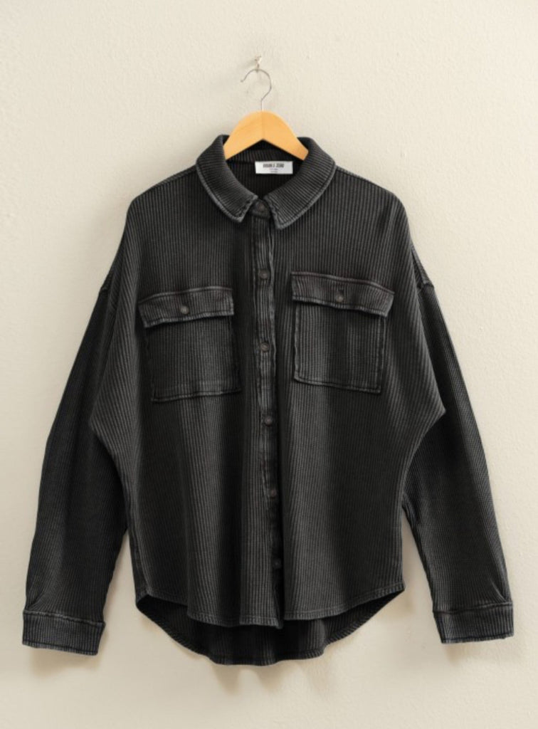 This oversized mineral wash waffle button shacket offers cozy warmth with a relaxed fit, perfect for layering on cool days. Its soft waffle texture provides breathable comfort, while the mineral wash adds a unique, lived-in look. Button closure makes it easy to style open or closed, letting you effortlessly elevate any casual outfit. Ideal for those seeking both comfort and effortless style in one versatile piece. 100% cotton. Size down for best fit.